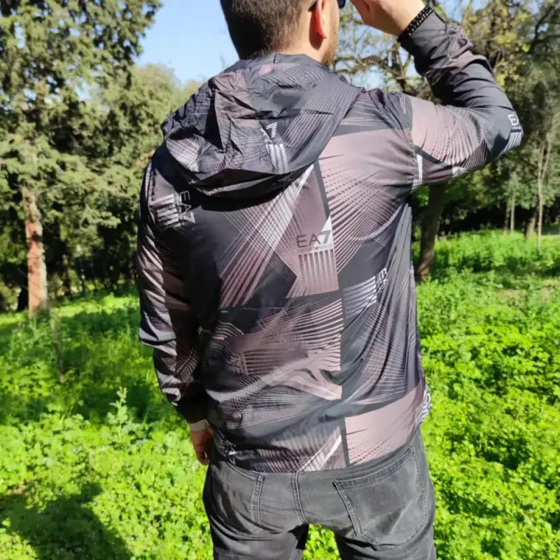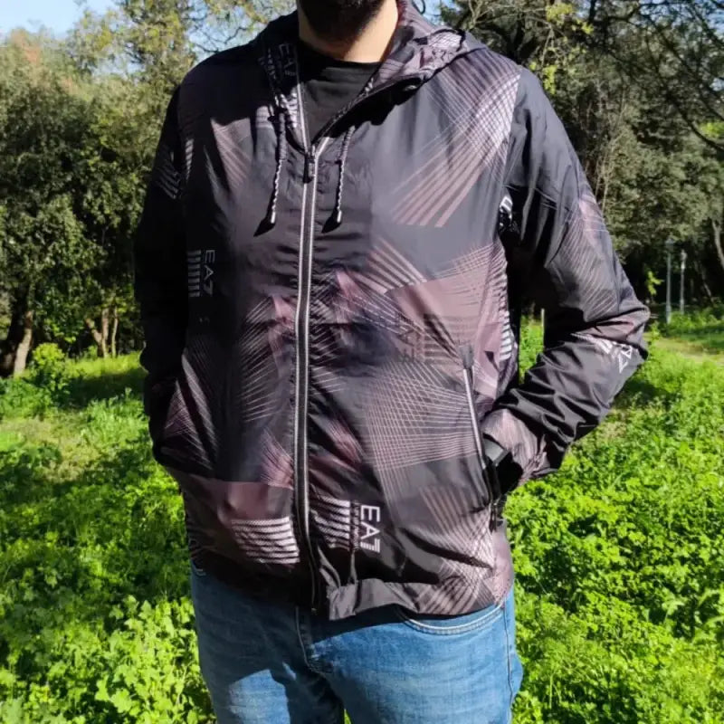 Ea7 kaput od vodootpornog materijala s kapuljačom u crnoj i pločastoj boji-314159